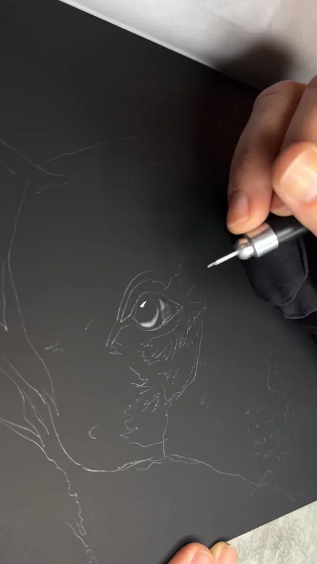 I create luminous scratchboard artworks where myth and nature converge. My series Primordial Daughters brings elemental goddesses to life through thousands of etched lines and glowing details.. This is the first in the series: The Goddess of Honey and Shadow.